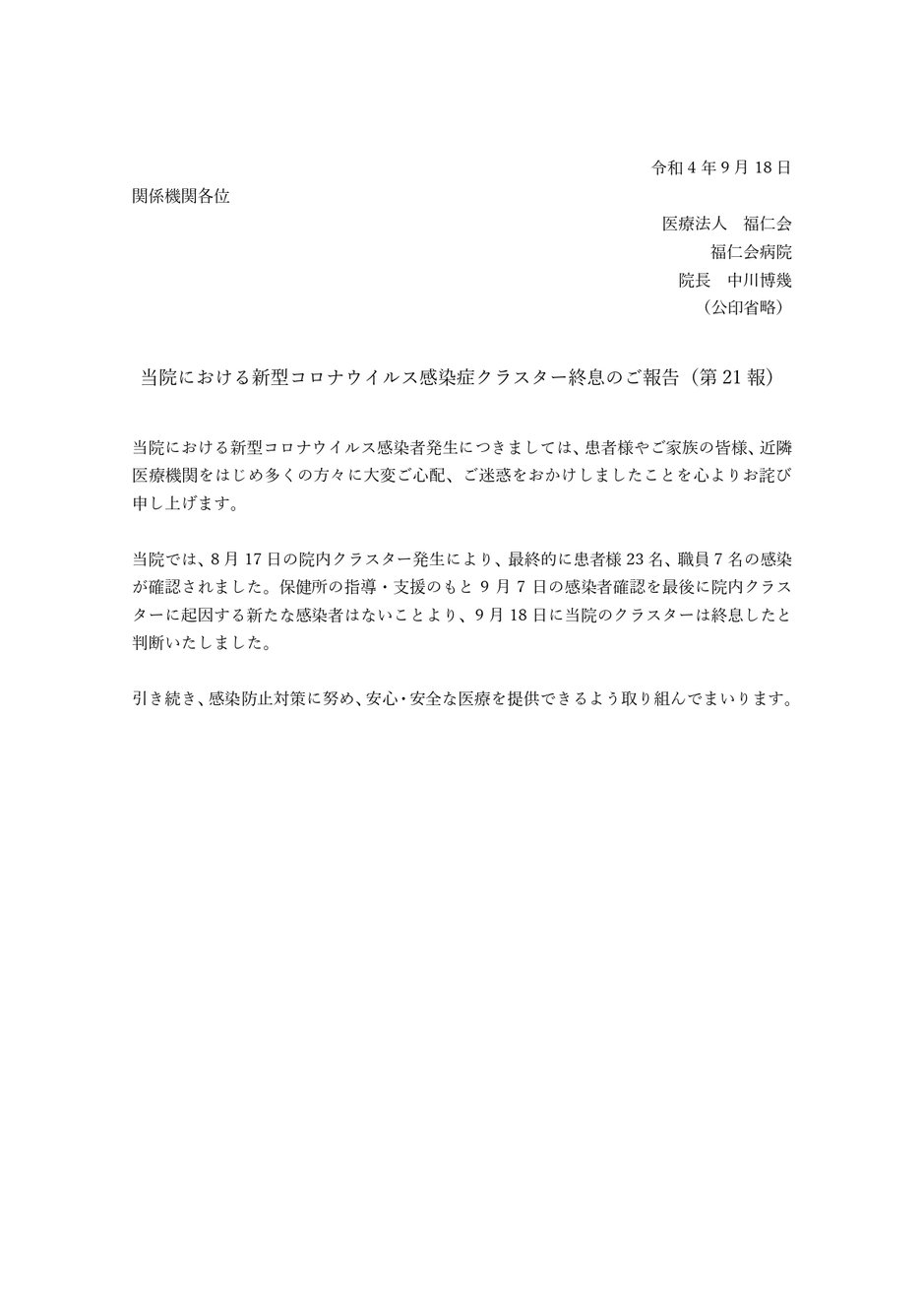 当院における新型コロナウイルス感染者の発生について(第21報)