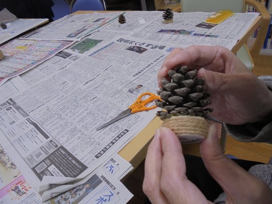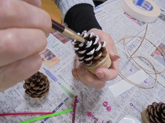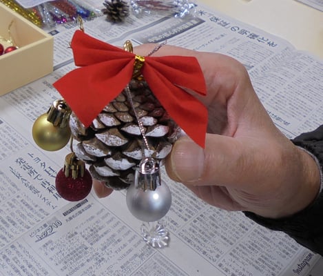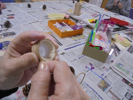 デイケア活動 · 2022/12/08 今週のデイケア・ナイトケア(12/5~12/9)① 12/6(火)AMはクリスマスの飾り作り。松ぼっくりに色を塗って、ビーズやモールで飾り付けをし、ミニツリーを作りました。また、松ぼっくりにリボンや金銀のボールなどをくっつけて、クリスマスオーナメントにしました。また、キッチンペーパーの芯を加工して雪の結晶を作りました。オーナメントや雪の結晶は病院入り口のツリーに飾らせてもらいました。 tagPlaceholderカテゴリ: